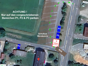 Bitte nutzt zum Parken nur die vorgeschriebenen Parkplätze. Der Pendlerparkplatz darf genutzt werden, haltet euch bitte an die Anweisung, damit es zu keinen Problemen mit der Gemeinde kommt. Auf dem Parkplatz wenden Schulbusse. Bitte nehmt darauf Rücksicht und parkt nur an der rechten Seite zu den Büschen bzw. der Hauptstraße hin. Lasst mindestens 2 Fahrzeuge Abstand zur angrenzenden Nebenstraße. Siehe Bild. Bei Fragen, melden.